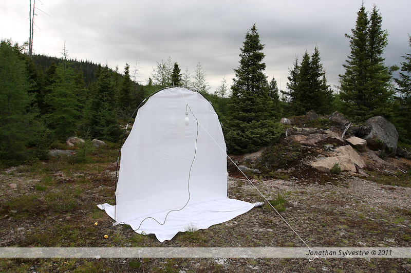 La majorité des papillons nocturnes sont difficiles à capturer le jour car il sont trop bien cachés, se laissent tomber au sol lorsqu'on les dérangent ou simplement parce qu'ils sont les rois du camoufflage. La meilleur méthode pour les capturer consiste à les piéger la nuit avec une lumière (voir photo ci-contre). C'est la méthode la plus efficace et celle que je préfère. Les papillons de nuit sont pris au piège à cause de leur "système de navigation" qui fonctionne normalement avec la lumière de la lune ou la faible lumière venant du ciel nocturne. Voici pourquoi : les rayons de lumières provenant du ciel viennent de très loin et sont pratiquement parallèles tandis que ceux provenant d'une ampoule partent dans toutes les directions. Plus on se rapproche de la source lumineuse, plus l'angle entre les rayons est grand. Les papillons de nuits perdent donc leur point de repère et se rapproche graduellement de la lumière. Lorsqu'il sont près, ils n'arrivent plus à se dirriger, tournoient jusqu'à l'épuisement et se posent sur le drap ou tout près. Avec un piège lumineux bien concus, on peut attirer presque tous les papillons noctures dans un rayon assez grand, tout dépendant de la source lumineuse utilisée, des conditions climatiques et de l'emplacement. Il suffit de sélectionner les spécimens que l'on veut capturer car souvent, de nombreux représentants de chaques espèces viennent au piège. Une autre méthode consiste à étendre un mélange de cassonade, mélasse, vinaigre et bière sur le tronc d'un arbre et attendre que les papillons viennent s'en nourrir. Il s'agit de la chasse à la miellée. Cette méthode est moins efficace mais elle permet de capturer des espèces qui ne viennent que très peu aux pièges lumineux. La difficulté avec cette méthode est de trouver la bonne recette ! Il y a plusieurs possibilité d'ingrédients : melon d'eau fermenté, bananes très mures, etc. Les résultats sont imprévisibles et il ne semble pas y avoir de liens avec la météo. Il semblerait que le fait d'utiliser cette technique à répétition à un endroit donnée augmente les chances de succès.